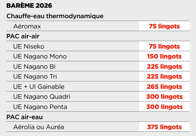 Grâce à vos achats de PAC air-air Nagano, Niseko, de PAC air-eau Aérolia et Auréa et, depuis cette année, de chauffe-eau thermodynamiques Aeromax, gagnez des lingots pour retrouver des cadeaux exceptionnels dans la boutique des Masters Thermor !